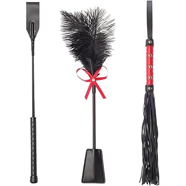 5 whips (one horse whip and spike whip inclusive),3 joint hand big customized dildos, 3 vibrators, latex cat suit and cat mask, 1 anal hook, 3 step butt plug(X3), 1 suspender, 2 collars, bondage bedspread, spanking paddle, restrainer, black bondage tape and x-nipple pasties/clamp.